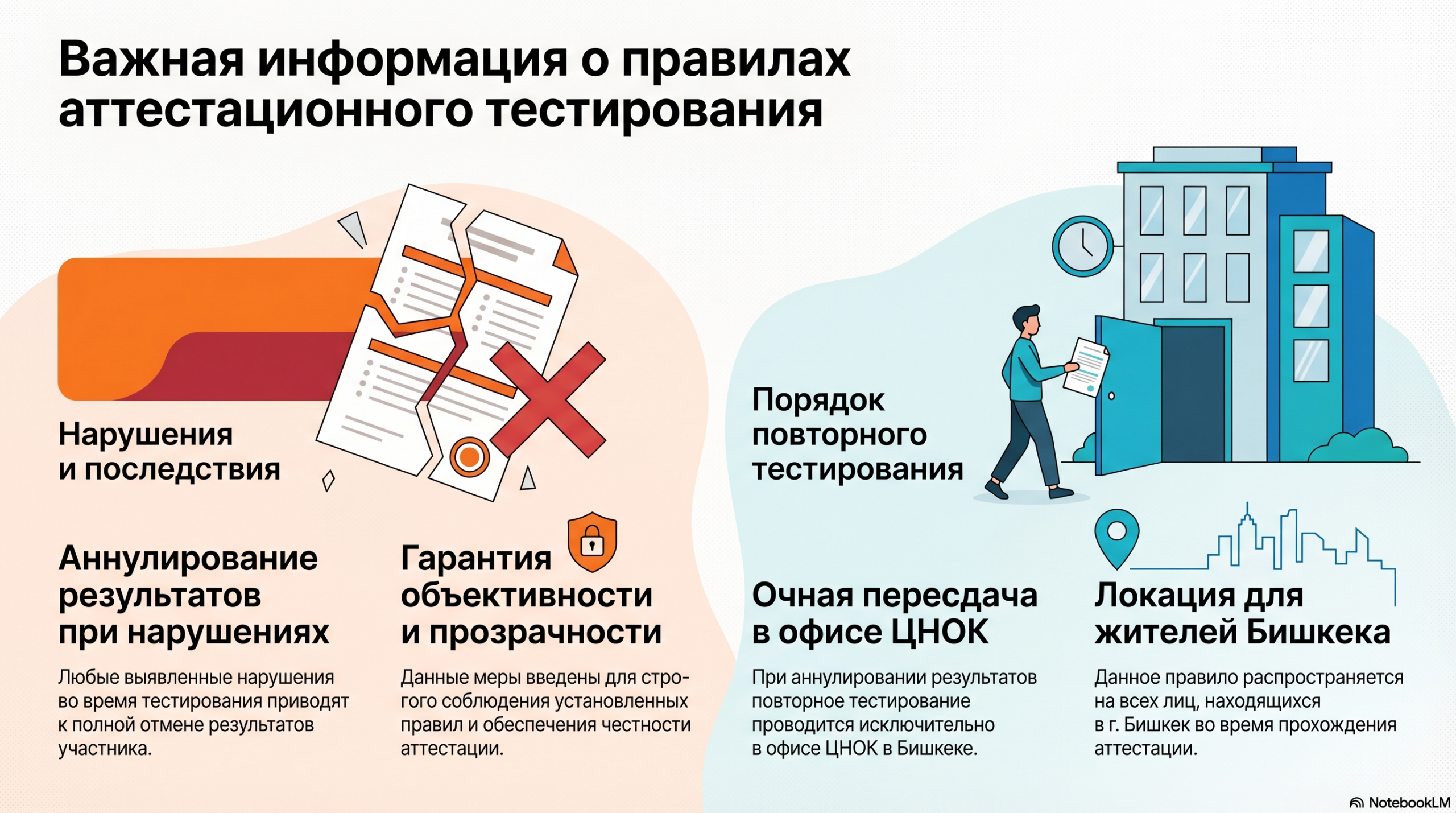 Для лиц, находящихся в Бишкеке, у которых результаты тестирования были аннулированы в процессе прохождения, повторное тестирование проводится исключительно в офисе ЦНОК (г. Бишкек).